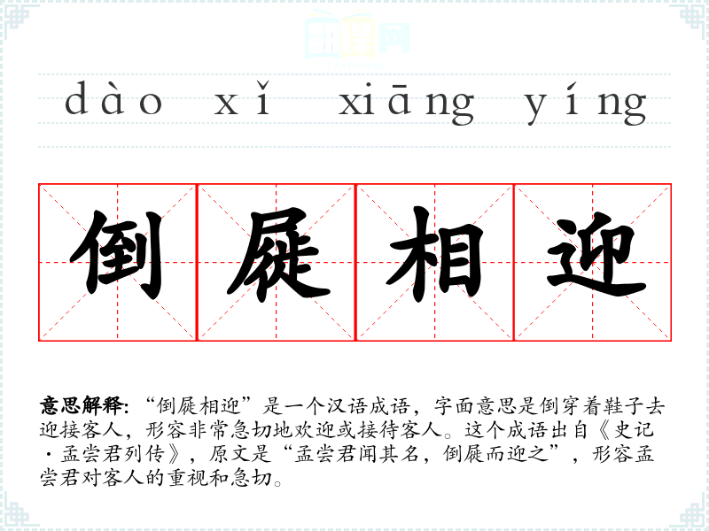 “倒屣相迎”是一个汉语成语,字面意思是倒穿着鞋子去迎接客人,形容非常急切地欢迎或接待客人。这个成语出自《史记·孟尝君列传》,原文是“孟尝君闻其名,倒屣而迎之”,形容孟尝君对客人的重视和急切。
