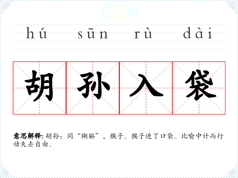 胡孙:同“猢狲”,猴子。猴子进了口袋。比喻中计而行动失去自由。