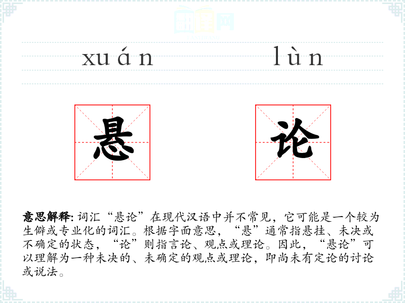 词汇“悬论”在现代汉语中并不常见,它可能是一个较为生僻或专业化的词汇。根据字面意思,“悬”通常指悬挂、未决或不确定的状态,“论”则指言论、观点或理论。因此,“悬论”可以理解为一种未决的、未确定的观点或理论,即尚未有定论的讨论或说法。