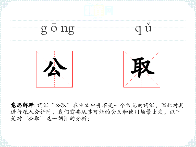 词汇“公取”在中文中并不是一个常见的词汇,因此对其进行深入分析时,我们需要从其可能的含义和使用场景出发。以下是对“公取”这一词汇的分析: