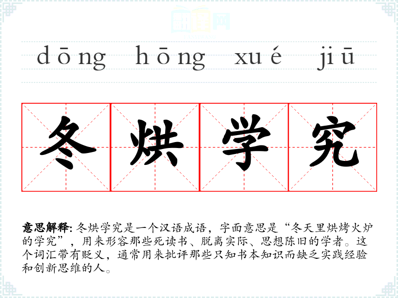 冬烘学究是一个汉语成语,字面意思是“冬天里烘烤火炉的学究”,用来形容那些死读书、脱离实际、思想陈旧的学者。这个词汇带有贬义,通常用来批评那些只知书本知识而缺乏实践经验和创新思维的人。