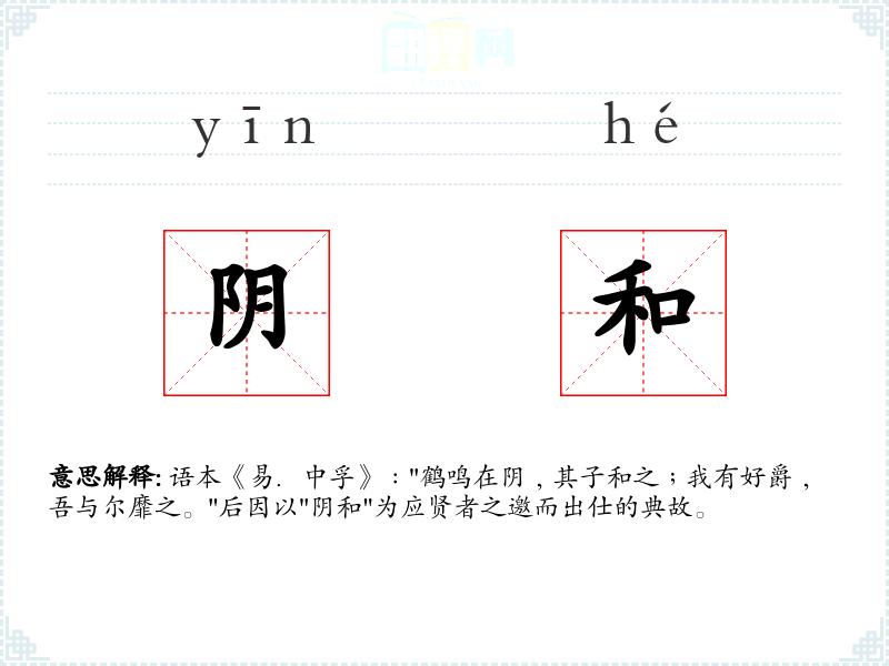语本《易.中孚》﹕"鹤鸣在阴﹐其子和之﹔我有好爵﹐吾与尔靡之。"后因以"阴和"为应贤者之邀而出仕的典故。