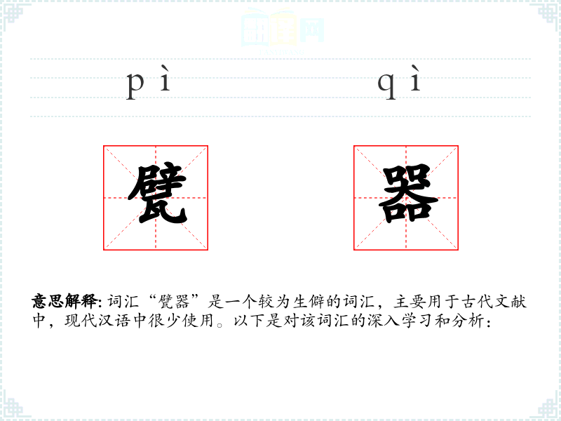 词汇“甓器”是一个较为生僻的词汇,主要用于古代文献中,现代汉语中很少使用。以下是对该词汇的深入学*和分析: