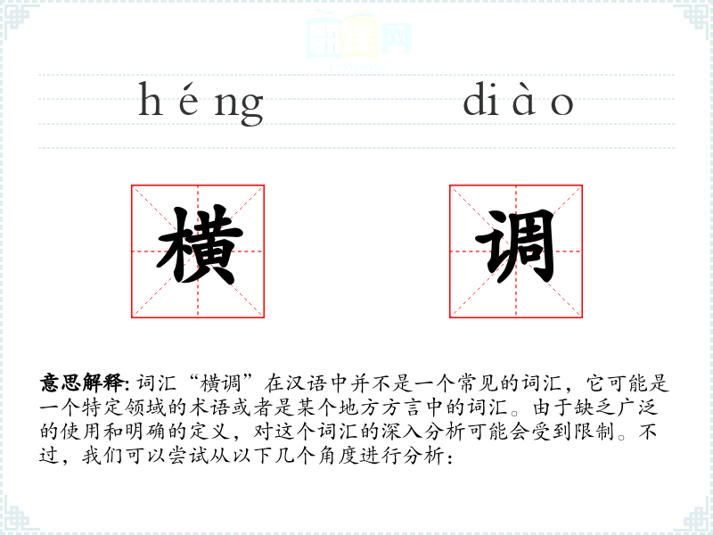 词汇“横调”在汉语中并不是一个常见的词汇,它可能是一个特定领域的术语或者是某个地方方言中的词汇。由于缺乏广泛的使用和明确的定义,对这个词汇的深入分析可能会受到限制。不过,我们可以尝试从以下几个角度进行分析: