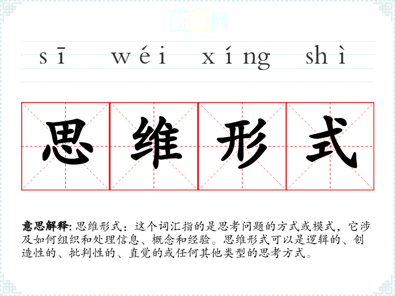 “思维形式”这个词汇在英语中对应的是“mode of thinking”或“form of thought”。在语言学和认知科学的发展中,这个概念逐渐被细化,成为研究人类认知过程的重要组成部分。