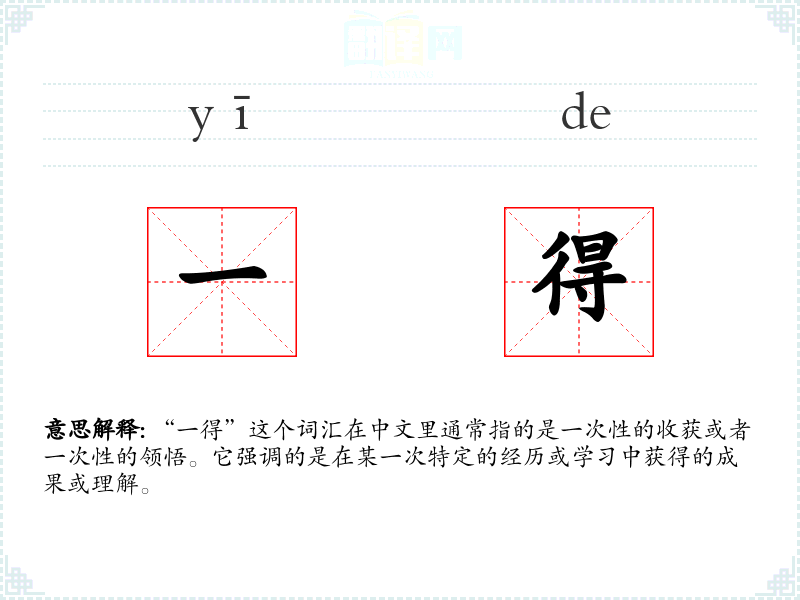 “一得”这个词汇在中文里通常指的是一次性的收获或者一次性的领悟。它强调的是在某一次特定的经历或学*中获得的成果或理解。