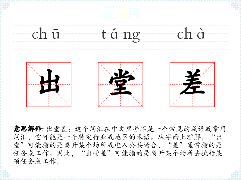 出堂差:这个词汇在中文里并不是一个常见的成语或常用词汇,它可能是一个特定行业或地区的术语。从字面上理解,“出堂”可能指的是离开某个场所或进入公共场合,“差”通常指的是任务或工作。因此,“出堂差”可能指的是离开某个场所去执行某项任务或工作。