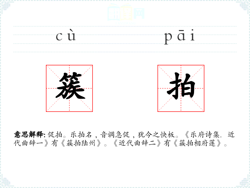 促拍。乐拍名﹐音调急促﹐犹今之快板。《乐府诗集.近代曲辞一》有《簇拍陆州》。《近代曲辞二》有《簇拍相府莲》。