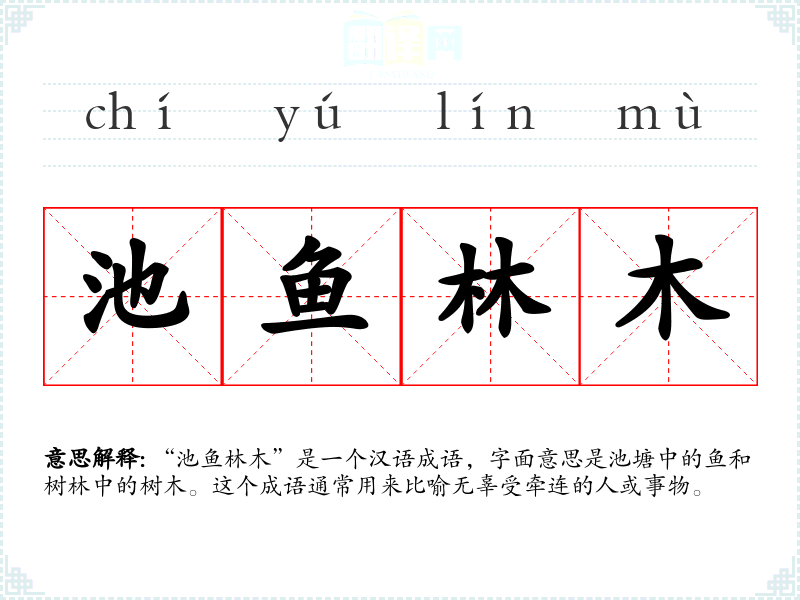 “池鱼林木”是一个汉语成语,字面意思是池塘中的鱼和树林中的树木。这个成语通常用来比喻无辜受牵连的人或事物。