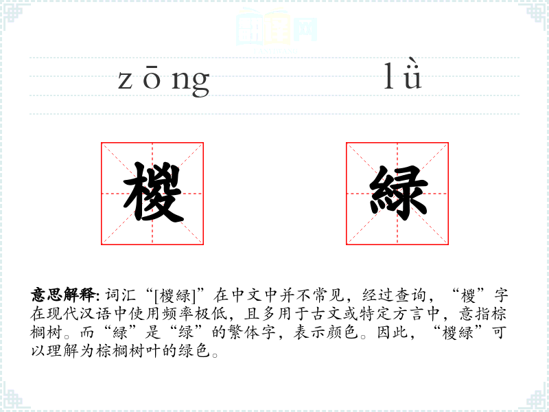 - 词源:“椶”源自古代对棕榈树的称呼,“緑”则是“绿”的繁体字。