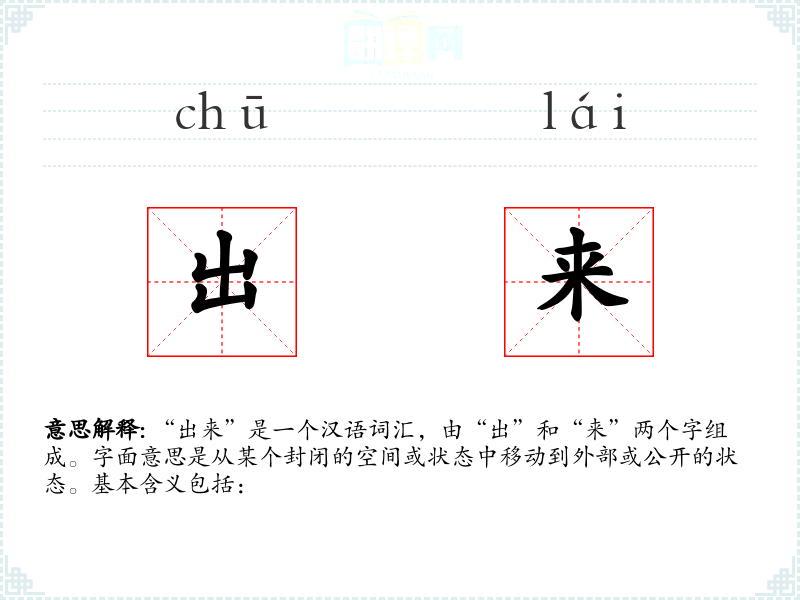 “出来”的词源可以追溯到古代汉语,其中“出”表示离开或超出,“来”表示移动或到达。随着时间的推移,这两个字的组合逐渐形成了表示从内部到外部的含义。
