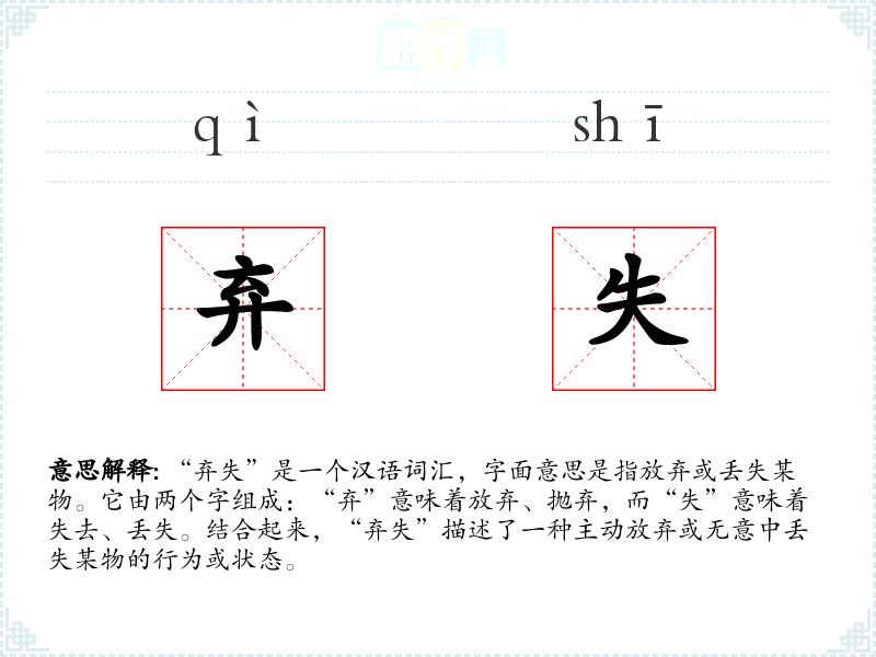 “弃失”是一个汉语词汇,字面意思是指放弃或丢失某物。它由两个字组成:“弃”意味着放弃、抛弃,而“失”意味着失去、丢失。结合起来,“弃失”描述了一种主动放弃或无意中丢失某物的行为或状态。