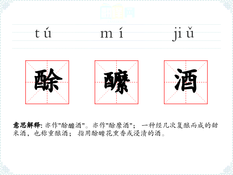 亦作"酴醾酒"。亦作"酴縻酒"; 一种经几次复酿而成的甜米酒,也称重酿酒; 指用酴醿花熏香或浸渍的酒。