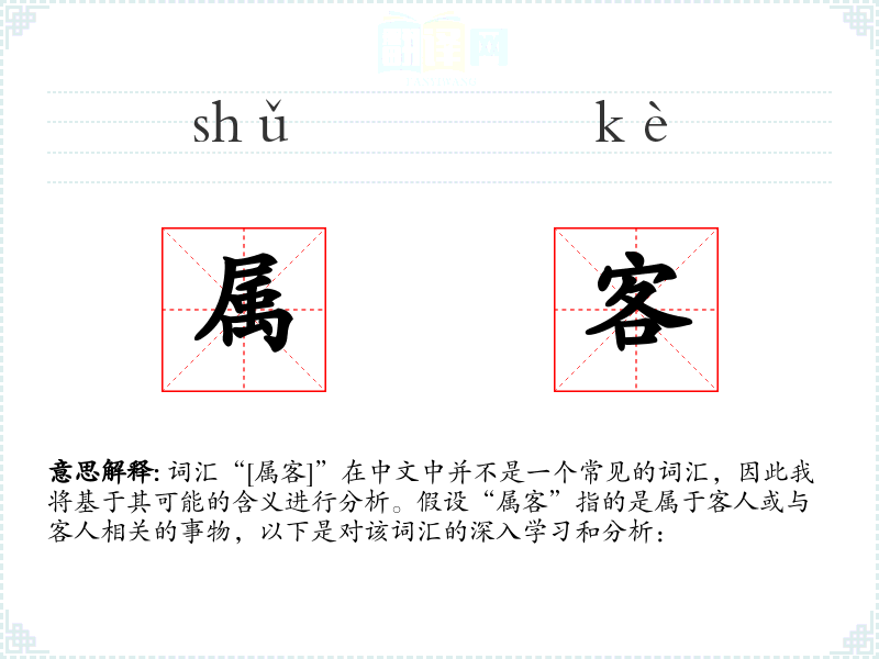 词汇“[属客]”在中文中并不是一个常见的词汇,因此我将基于其可能的含义进行分析。假设“属客”指的是属于客人或与客人相关的事物,以下是对该词汇的深入学习和分析: