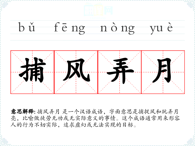 捕风弄月 是一个汉语成语,字面意思是捕捉风和玩弄月亮,比喻做徒劳无功或无实际意义的事情。这个成语通常用来形容人的行为不切实际,追求虚幻或无法实现的目标。