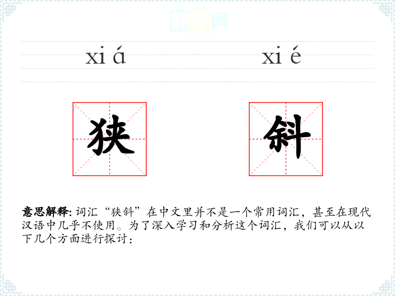 词汇“狭斜”在中文里并不是一个常用词汇,甚至在现代汉语中几乎不使用。为了深入学习和分析这个词汇,我们可以从以下几个方面进行探讨: