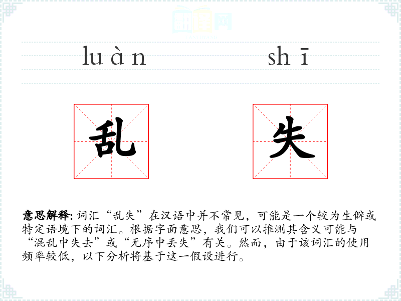 词汇“乱失”在汉语中并不常见,可能是一个较为生僻或特定语境下的词汇。根据字面意思,我们可以推测其含义可能与“混乱中失去”或“无序中丢失”有关。然而,由于该词汇的使用频率较低,以下分析将基于这一假设进行。
