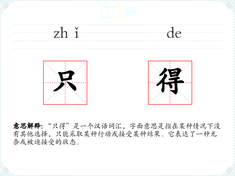 “只得”由“只”和“得”两个字组成。“只”在古代汉语中表示“仅仅”或“只有”,“得”表示“能够”或“得到”。随着语言的发展,“只得”逐渐演变为表示无奈选择的固定搭配。