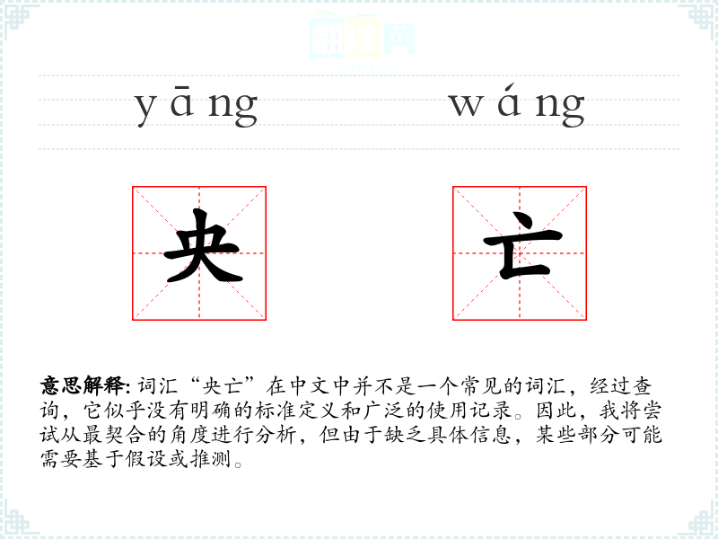 词汇“央亡”在中文中并不是一个常见的词汇,经过查询,它似乎没有明确的标准定义和广泛的使用记录。因此,我将尝试从最契合的角度进行分析,但由于缺乏具体信息,某些部分可能需要基于假设或推测。