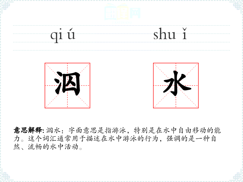 泅水:字面意思是指游泳,特别是在水中自由移动的能力。这个词汇通常用于描述在水中游泳的行为,强调的是一种自然、流畅的水中活动。