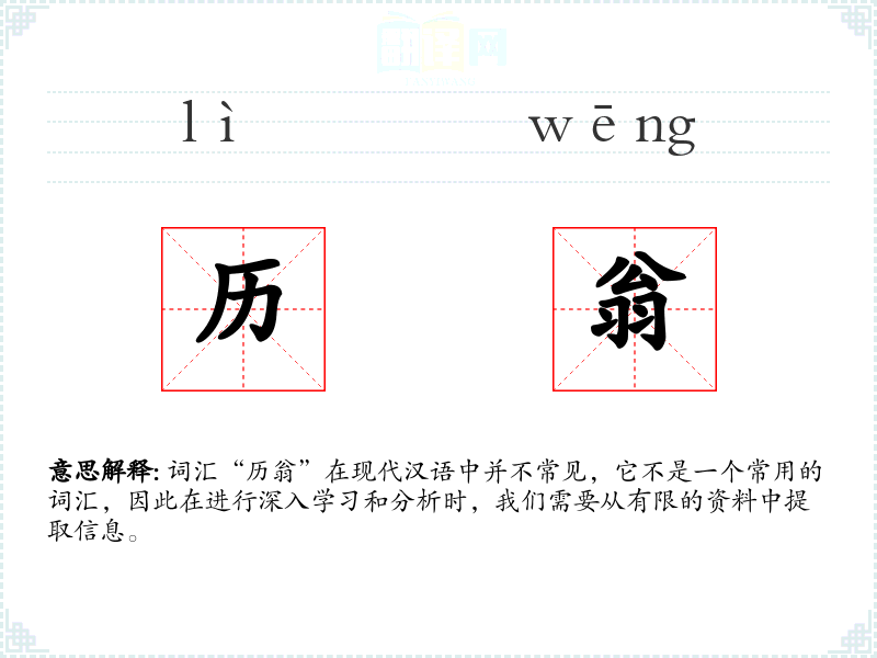 词汇“历翁”在现代汉语中并不常见,它不是一个常用的词汇,因此在进行深入学*和分析时,我们需要从有限的资料中提取信息。
