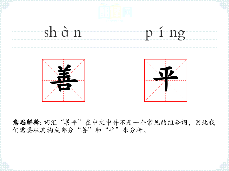 词汇“善平”在中文中并不是一个常见的组合词,因此我们需要从其构成部分“善”和“平”来分析。