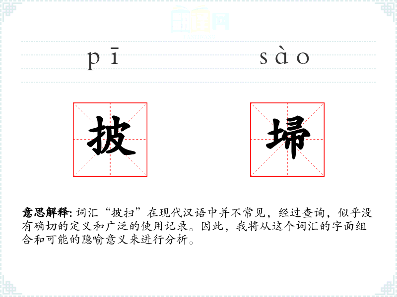 由于“披扫”不是一个常用词汇,个人应用不明确。如果在一个特定的社群或领域中,它可能被用来形容某种全面或彻底的行为。