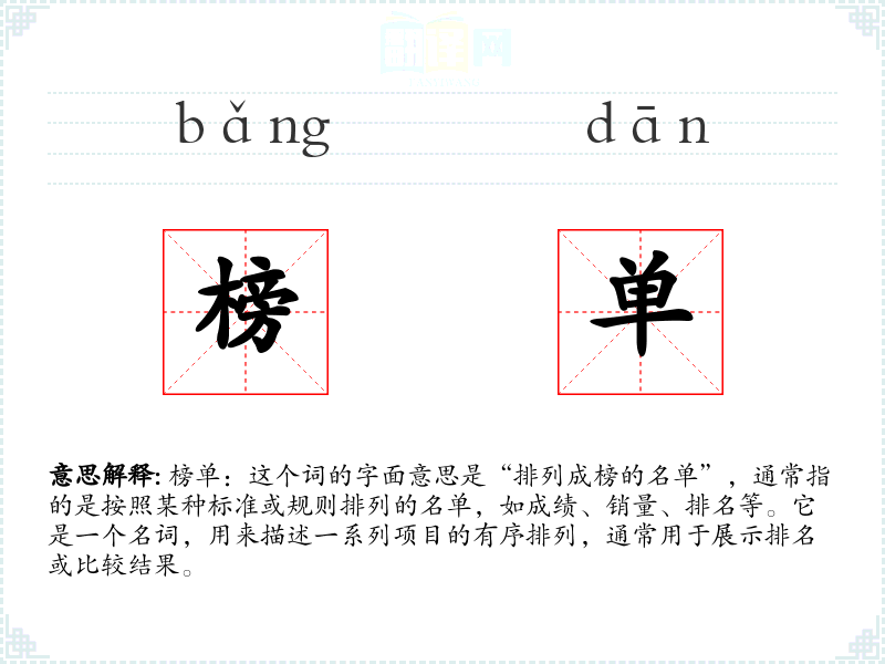 榜单:这个词的字面意思是“排列成榜的名单”,通常指的是按照某种标准或规则排列的名单,如成绩、销量、排名等。它是一个名词,用来描述一系列项目的有序排列,通常用于展示排名或比较结果。