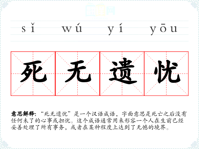 “死无遗忧”是一个汉语成语,字面意思是死亡之后没有任何未了的心事或担忧。这个成语通常用来形容一个人在生前已经妥善处理了所有事务,或者在某种程度上达到了无憾的境界。