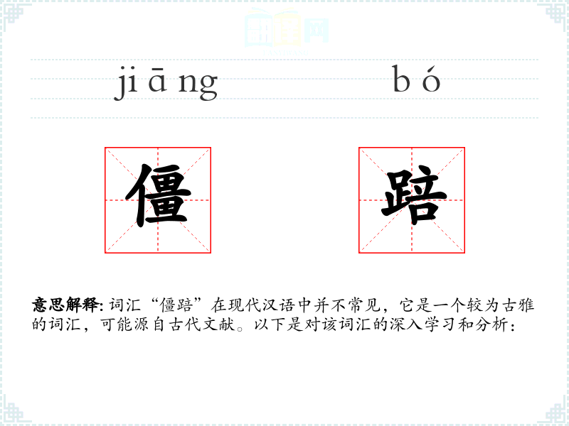 词汇“僵踣”在现代汉语中并不常见,它是一个较为古雅的词汇,可能源自古代文献。以下是对该词汇的深入学习和分析: