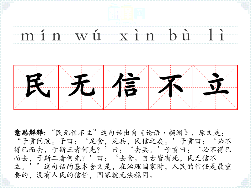 “民无信不立”这句话出自《论语·颜渊》,原文是:“子贡问政。子曰:‘足食,足兵,民信之矣。’子贡曰:‘必不得已而去,于斯三者何先?’曰:‘去兵。’子贡曰:‘必不得已而去,于斯二者何先?’曰:‘去食。自古皆有死,民无信不立。’”这句话的基本含义是,在治理国家时,人民的信任是最重要的,没有人民的信任,国家就无法稳固。