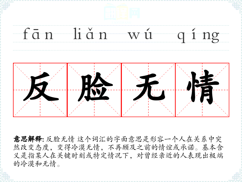 反脸无情 这个词汇的字面意思是形容一个人在关系中突然改变态度,变得冷漠无情,不再顾及之前的情谊或承诺。基本含义是指某人在关键时刻或特定情况下,对曾经亲近的人表现出极端的冷漠和无情。
