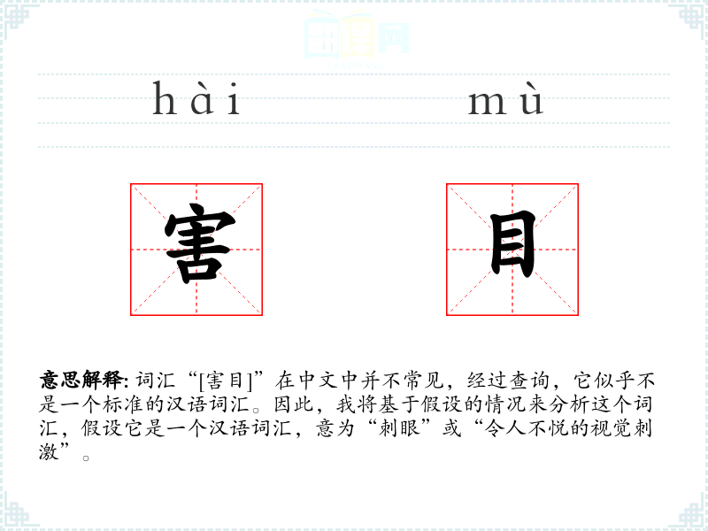 词汇“[害目]”在中文中并不常见,经过查询,它似乎不是一个标准的汉语词汇。因此,我将基于假设的情况来分析这个词汇,假设它是一个汉语词汇,意为“刺眼”或“令人不悦的视觉刺激”。
