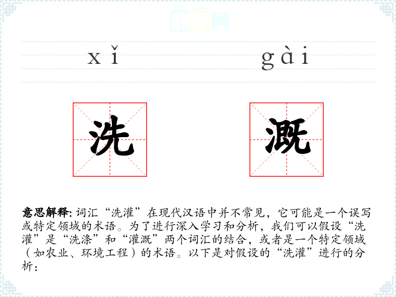 - 尽管“洗灌”不是一个常用词汇,但通过假设和分析,我们可以看到它在特定领域的可能应用和意义。在语言学习和表达中,理解特定术语的背景和用法对于专业交流非常重要。