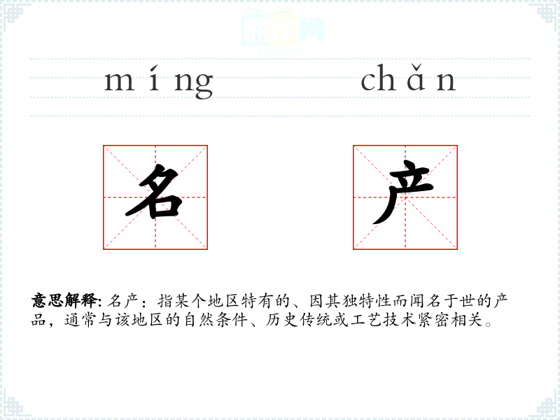 名产:指某个地区特有的、因其独特性而闻名于世的产品,通常与该地区的自然条件、历史传统或工艺技术紧密相关。