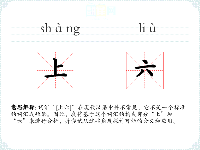 - 反义词:由于“上六”特定于某些语境,没有直接的反义词。