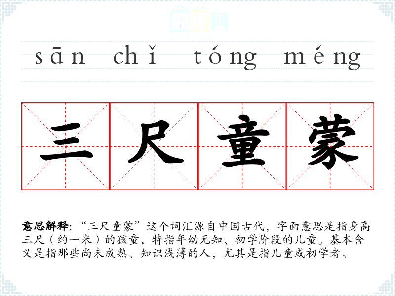 “三尺童蒙”这个词汇源自*古代,字面意思是指身高三尺(约一米)的孩童,特指年幼无知、初学阶段的儿童。基本含义是指那些尚未成熟、知识浅的人,尤其是指儿童或初学者。