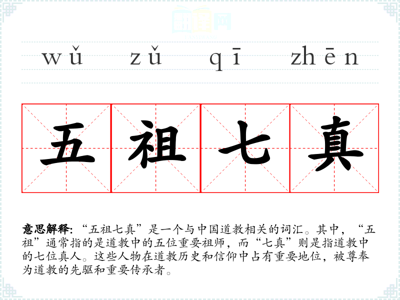 “五祖七真”是一个与**道教相关的词汇。其中,“五祖”通常指的是道教中的五位重要祖师,而“七真”则是指道教中的七位真人。这些人物在道教历史和信仰中占有重要地位,被尊奉为道教的先驱和重要传承者。