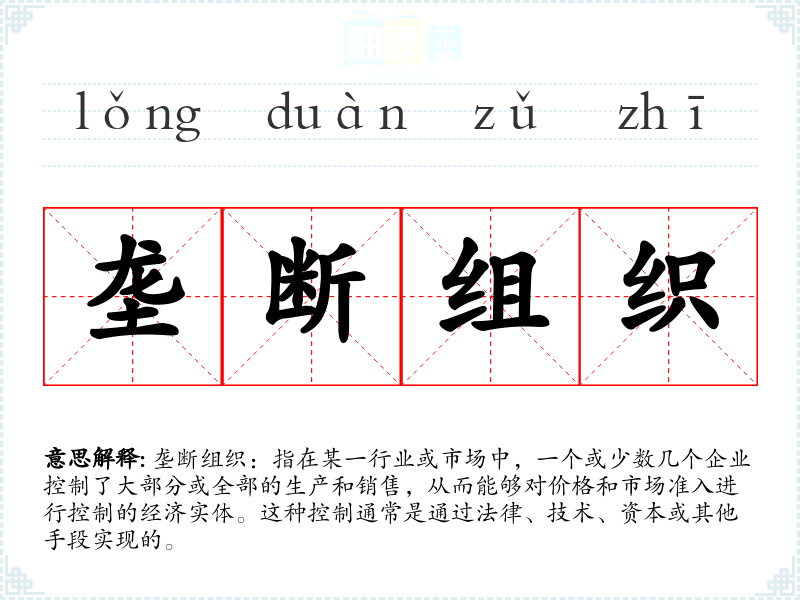 垄断组织:指在某一行业或市场中,一个或少数几个企业控制了大部分或全部的生产和销售,从而能够对价格和市场准入进行控制的经济实体。这种控制通常是通过法律、技术、资本或其他手段实现的。