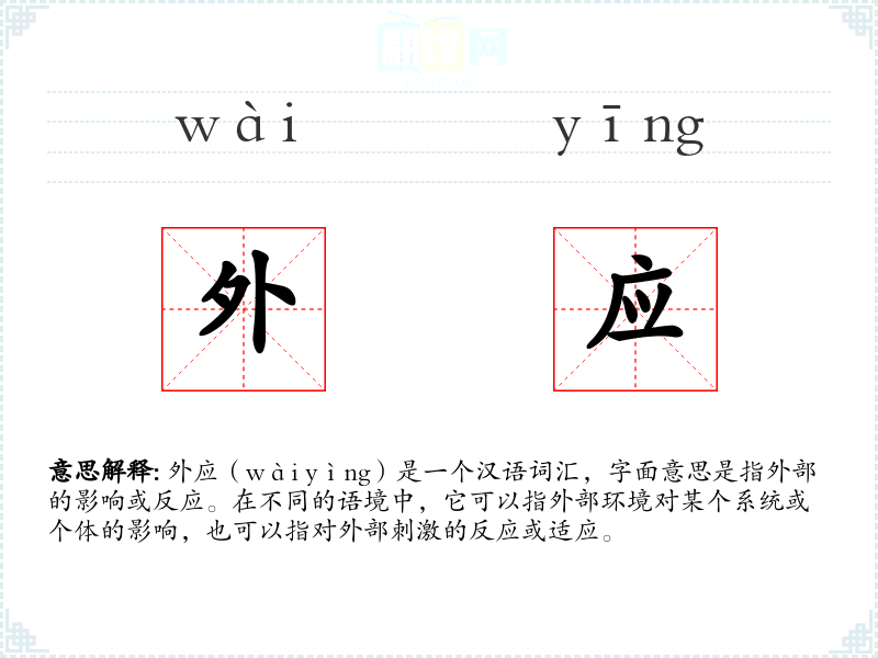 外应这个词汇源于汉语,由“外”和“应”两个字组成。在古代汉语中,“应”字常用来表示响应或适应,而“外”则指外部。随着时间的推移,这个词汇的含义逐渐丰富,涵盖了更广泛的语境。