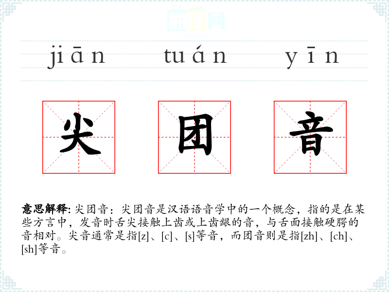 尖团音:尖团音是汉语语音学中的一个概念,指的是在某些方言中,发音时舌尖接触上齿或上齿龈的音,与舌面接触硬腭的音相对。尖音通常是指[z]、[c]、[s]等音,而团音则是指[zh]、[ch]、[sh]等音。