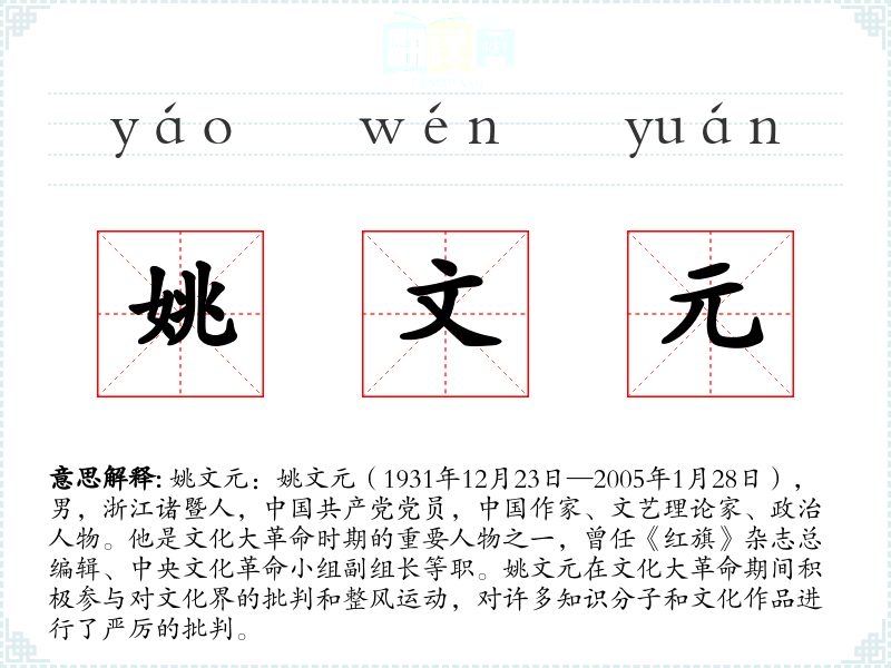 ****:(1931年12月23日—2005年1月28日),男,浙江诸暨人,共产党党员,作家、文艺理论家、政治人物。他是文化大革命时期的重要人物之一,曾任《红旗》杂志总编辑、中央文化革命小组副组长等职。*在文化大革命期间积极参与对文化界的批判和整风,对许多知识分子和文化作品进行了严厉的批判。