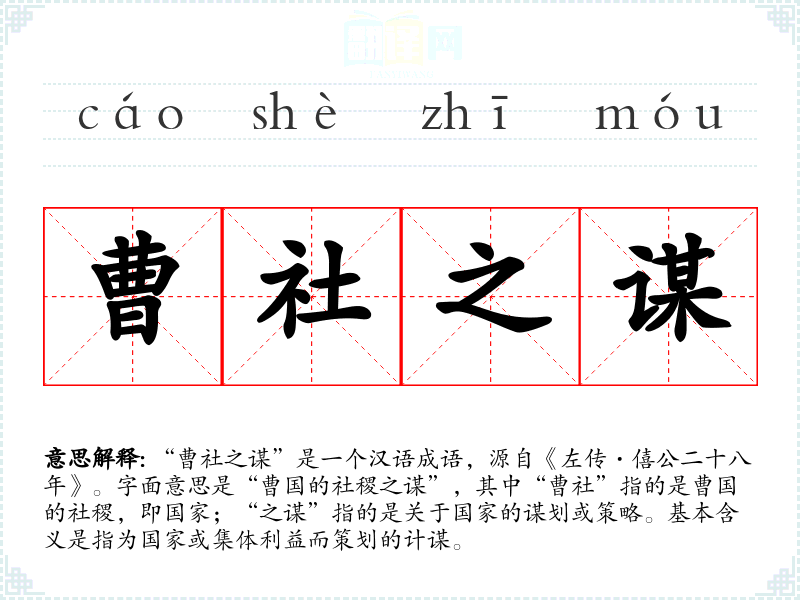 “曹社之谋”源自《左传》,是古代史书,记载了春秋时期的历史。随着时间的推移,这个成语被广泛应用于各种语境,但其核心含义——为国家或集体利益而策划的计谋——保持不变。