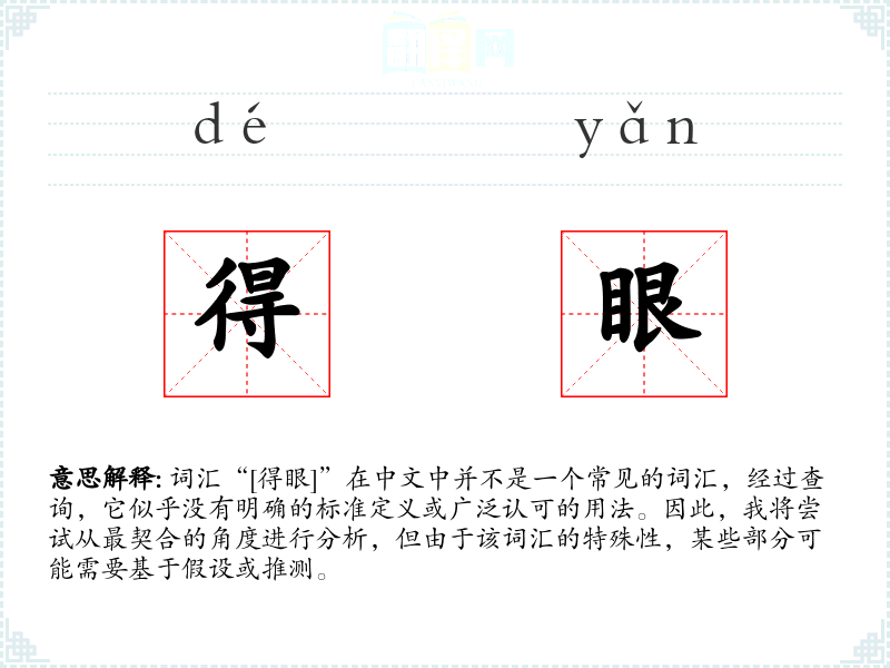词汇“[得眼]”在中文中并不是一个常见的词汇,经过查询,它似乎没有明确的标准定义或广泛认可的用法。因此,我将尝试从最契合的角度进行分析,但由于该词汇的特殊性,某些部分可能需要基于假设或推测。