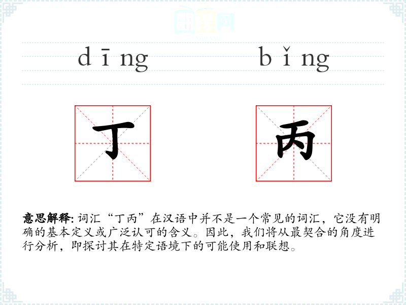 由于“丁丙”不是一个标准词汇,我们无法提供一个确切的基本定义。它可能是由两个汉字“丁”和“丙”组合而成的,这两个字在汉语中各自有其含义。