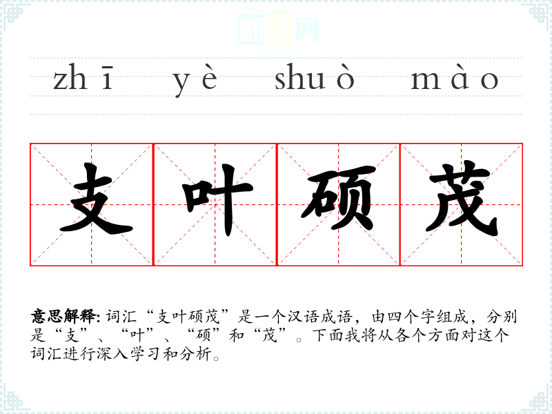 词汇“支叶硕茂”是一个汉语成语,由四个字组成,分别是“支”、“叶”、“硕”和“茂”。下面我将从各个方面对这个词汇进行深入学*和分析。