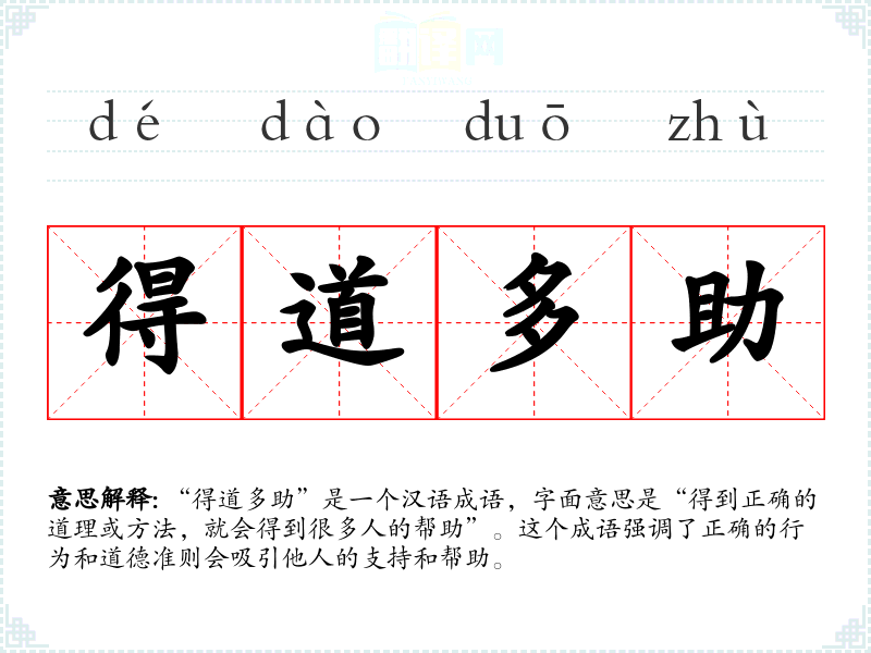 “得道多助”是一个汉语成语,字面意思是“得到正确的道理或方法,就会得到很多人的帮助”。这个成语强调了正确的行为和道德准则会吸引他人的支持和帮助。