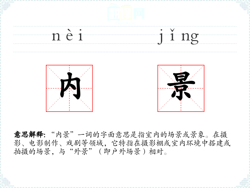 “内景”一词由“内”和“景”两个字组成。在古代汉语中,“内”指内部,“景”指景象或景色。随着时间的推移,这个词在现代汉语中被广泛用于描述室内的场景或景象,尤其是在艺术和娱乐行业。
