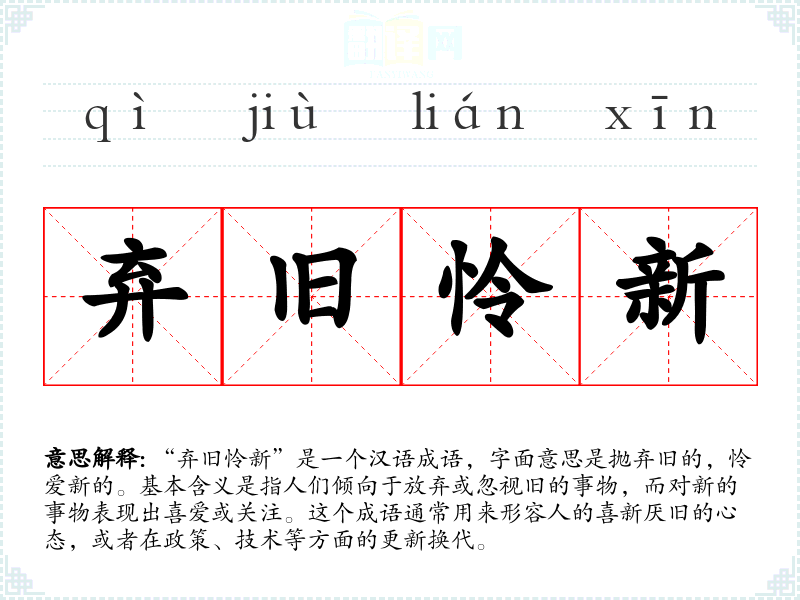 “弃旧怜新”这个成语的词源较为明确,直接反映了其字面意思。在古代文献中,这个成语就已经出现,用以描述人的心理和行为。随着时间的推移,其使用范围和语境有所扩展,但基本含义保持不变。