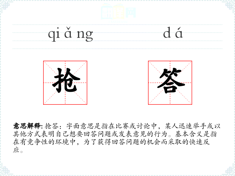 抢答一词源于汉语,由“抢”和“答”两个字组成。在古代汉语中,“抢”有争夺的意思,“答”则是回答。随着时间的推移,这个词被广泛用于描述在各种竞赛或讨论中的快速反应行为。